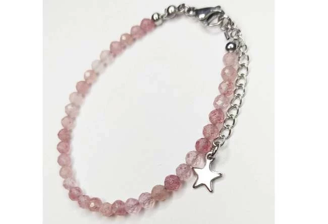 Детский браслет клубничный кварц собран на ювелирный тросик с удлиняющей цепочкой с использованием стальной фурнитуры (не темнеет, гипоаллергенна).