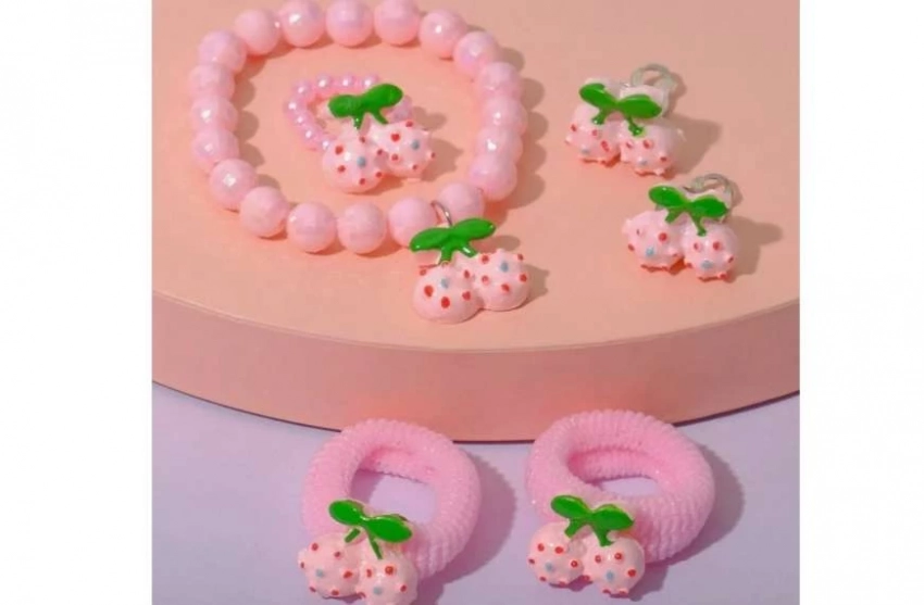 Комплект детский пять предметов: две резинки, клипсы, браслет, кольцо, вишенки, Всё самое лучшее — детям. Аксессуары — это отличный вариант подарка ребёнку.