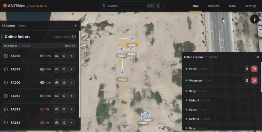 Существующие и перспективные платформы и роботы семейства ANTS должны работать самостоятельно или в составе групп-роёв. Для взаимодействия машин друг с другом и оператором разработана система «управления полем боя» ANTSNet. Она включает необходимые средства связи и программные компоненты, предназначенные для установки на роботах. Кроме того, аналогичные средства используются на операторских станциях.