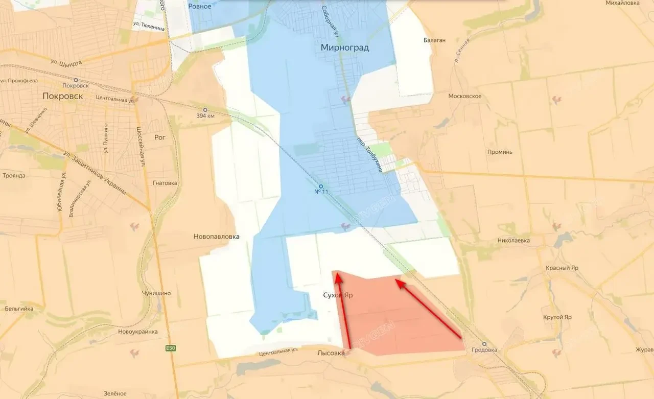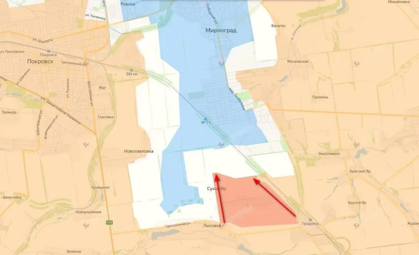 Российские войска продвинулись с южной стороны Мирнограда, установив полный контроль над населенным пунктом Сухой Яр. Об этом сообщают российские ресурсы и подтверждает Минобороны.
