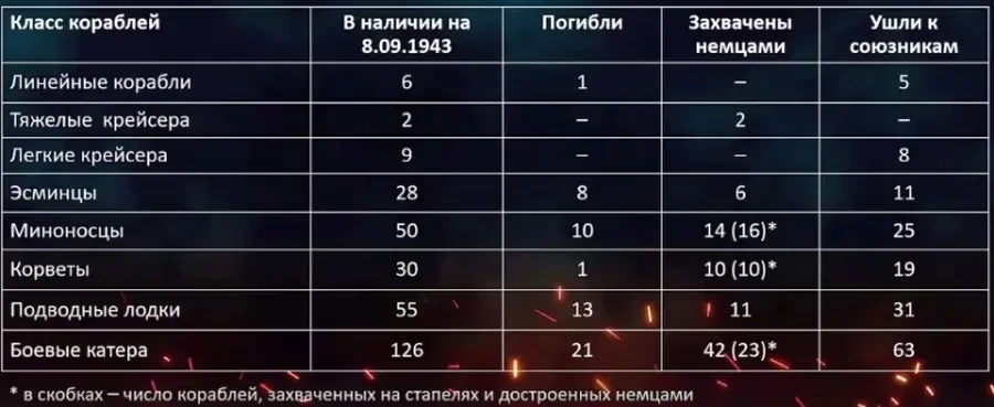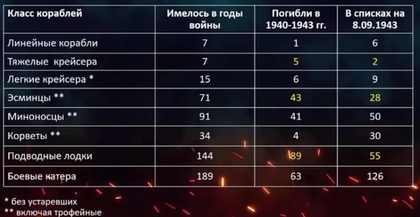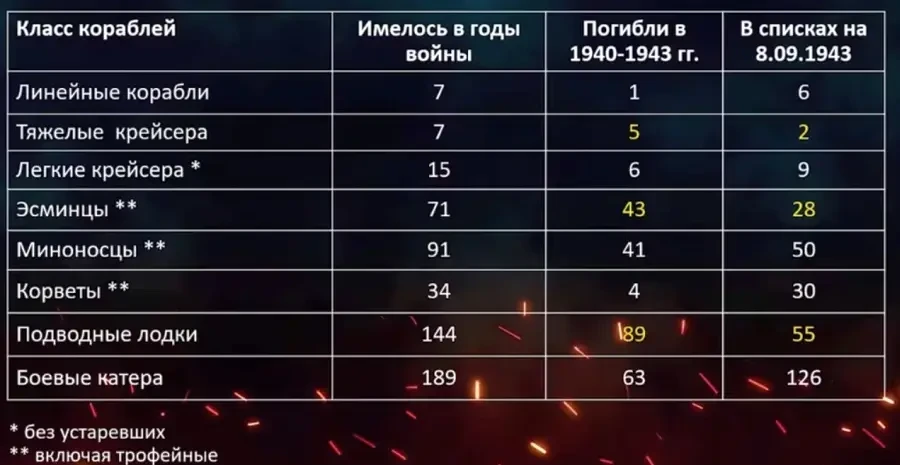 Состав итальянского Военно-морского флота в период войны и на момент подписания перемирия, включая трофейные и потерянные в боях корабли, приведен в таблице.