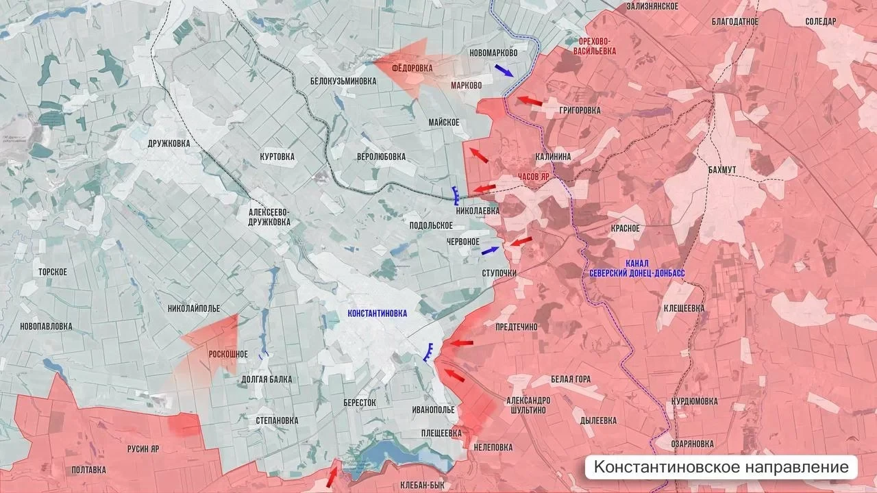 На Константиновском направлении армия России продвигается по дороге Яблоновка - Степановка к Берестку. После освобождения Иванополья идет битва за высоты у Клебан-Быкского водохранилища. Украинские источники подтверждают отход гарнизона ВСУ из центра Константиновки на северные окраины, в то время как на юго-востоке города продолжаются городские бои.