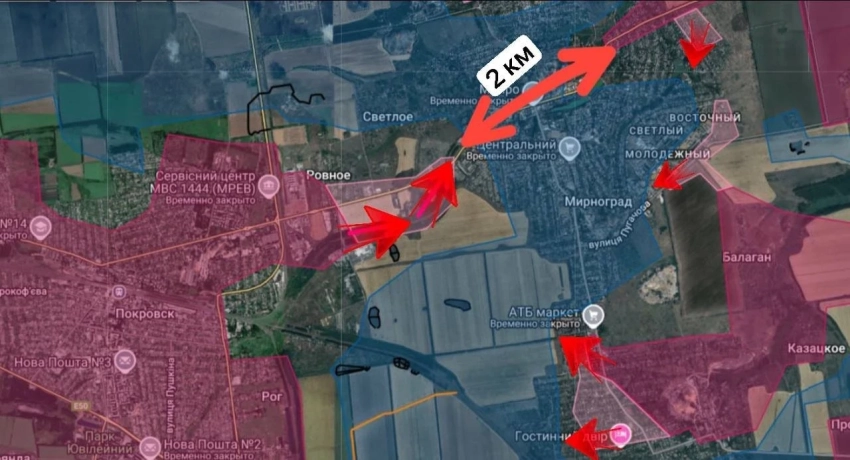 Теперь зона между нашими подразделениями в «горлышке» около 2 км. И это без серой зоны. То есть по сути противник окружен. Поступает информация о том, что штурмовые подразделения ВС РФ, пробившись через опорные пункты ВСУ, вошли в Мирноград со стороны н.п. Ровное.