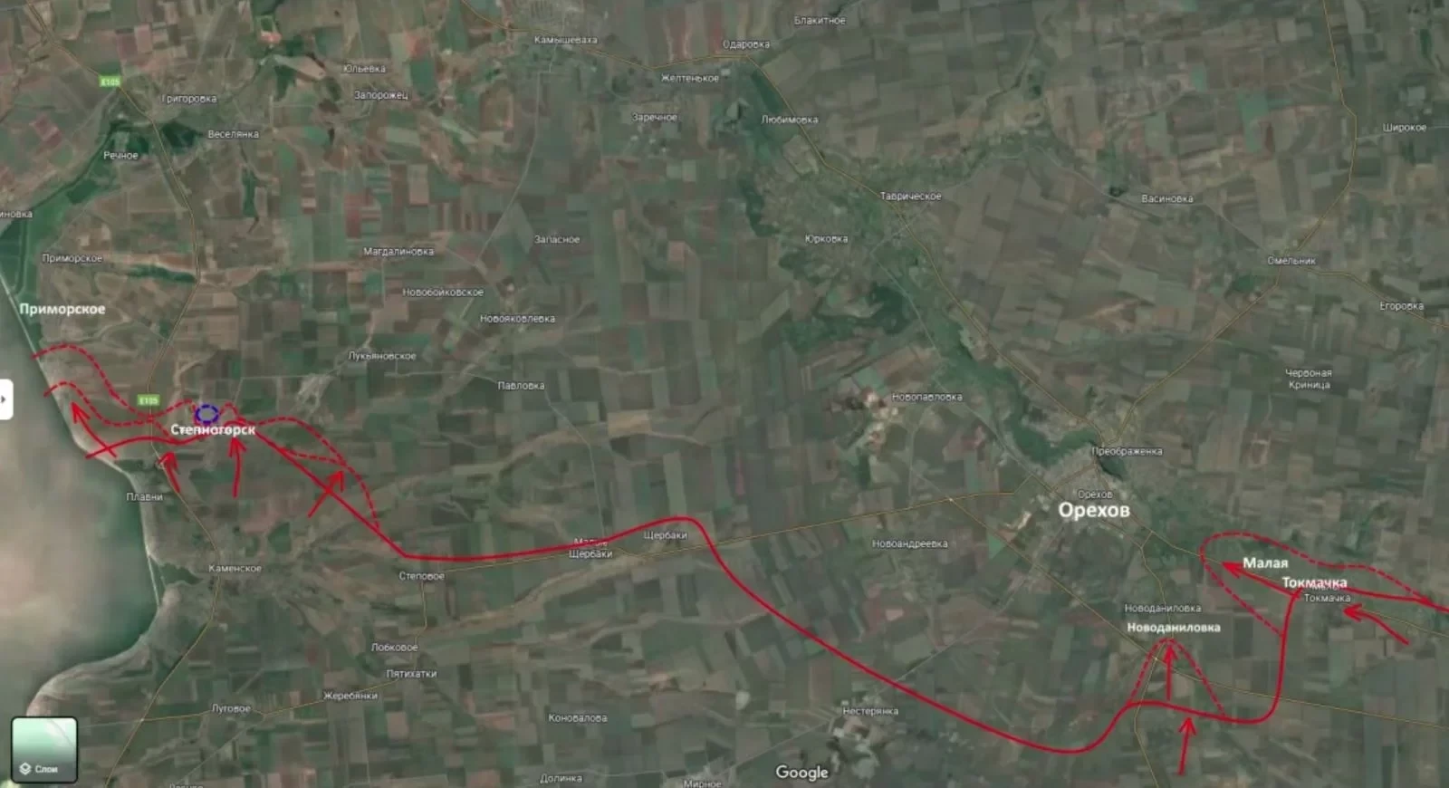 Не менее напряженная ситуация складывается на южном участке Запорожского фронта (линия Степногорск - Приморское - Орехов). Н данном участке фронта российские войска применяют иную тактику, которую Подоляка охарактеризовал как «медленное и ползучее» наступление.