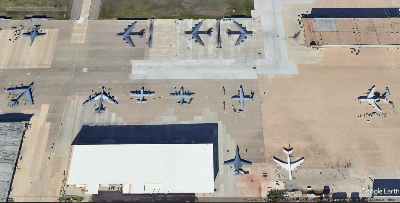 Спутниковый снимок Google Earth: самолёты ДРЛО Boeing E-3G Sentry и заправщики Boeing KC-135R Stratotanker на авиабазе Тинкер