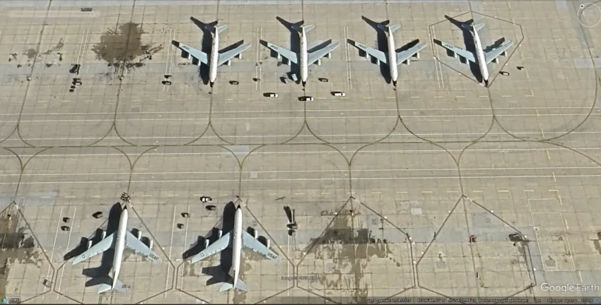 Спутниковый снимок Google Earth: самолёты ДРЛО Boeing E-3G Sentry и Boeing КС-46А Pegasus на авиабазе Аль-Дафра. Снимок сделан в октябре 2020 года