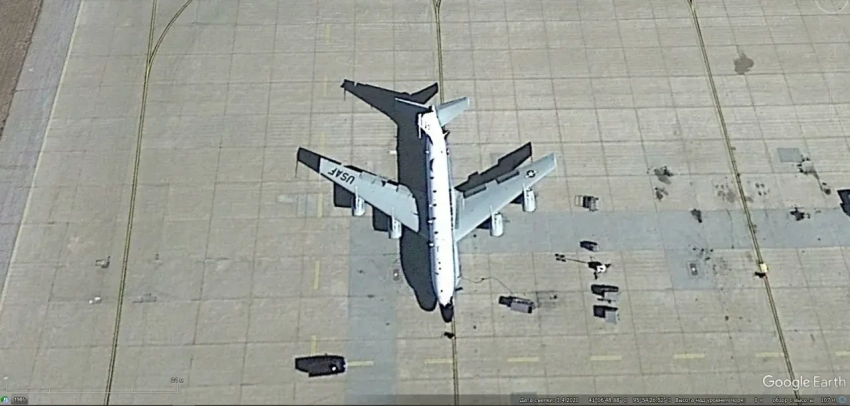 Спутниковый снимок Google Earth: самолёт Boeing RC-135W Rivet Joint на авиабазе Оффут