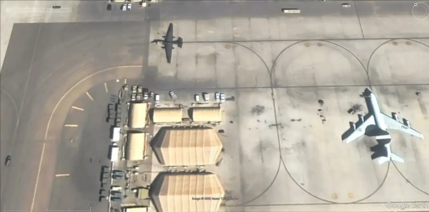Спутниковый снимок Google Earth: самолёты Lockheed U-2S Dragon Lady и Boeing E-3G Sentry на авиабазе Аль-Дафра