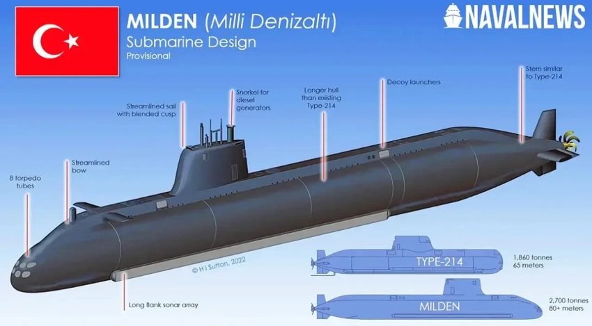 MİLDEN – это ДЭПЛ с ВНЭУ, имеющая большие габариты по сравнению с Reis: её длина составит свыше 80 м, а водоизмещение около 2700 тонн. Вооружение будет представлено 8 ТА с национальными 533-мм торпедами Akya, ПКР Sub-Atmaca, крылатыми ракетами GEZGIN. Подлодка получит на оснащение собственные гидролокаторы и РЛС.
