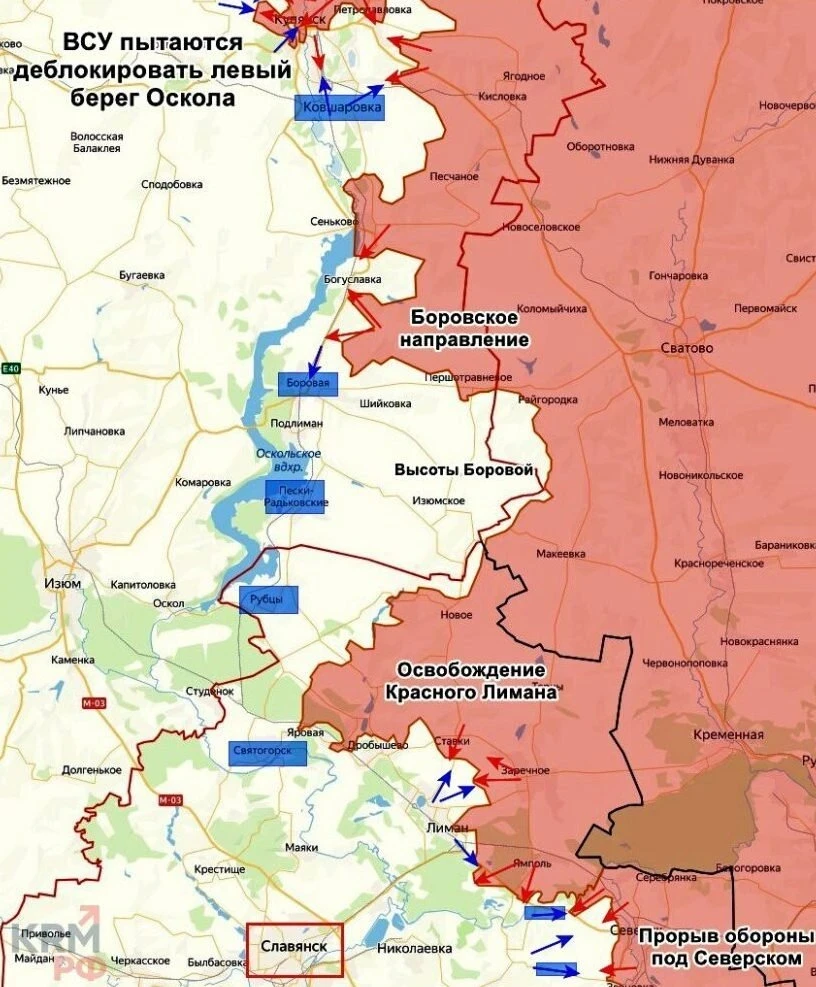 На Харьковском направлении ВС РФ практически освободили Вильчу, противник сохраняет позиции на южных окраинах. Западнее Лимана в районе Прилипки идут бои. Наши бойцы закрепляются на западных окраинах Волчанских Хуторов и постепенно продвигаются в этом селе.