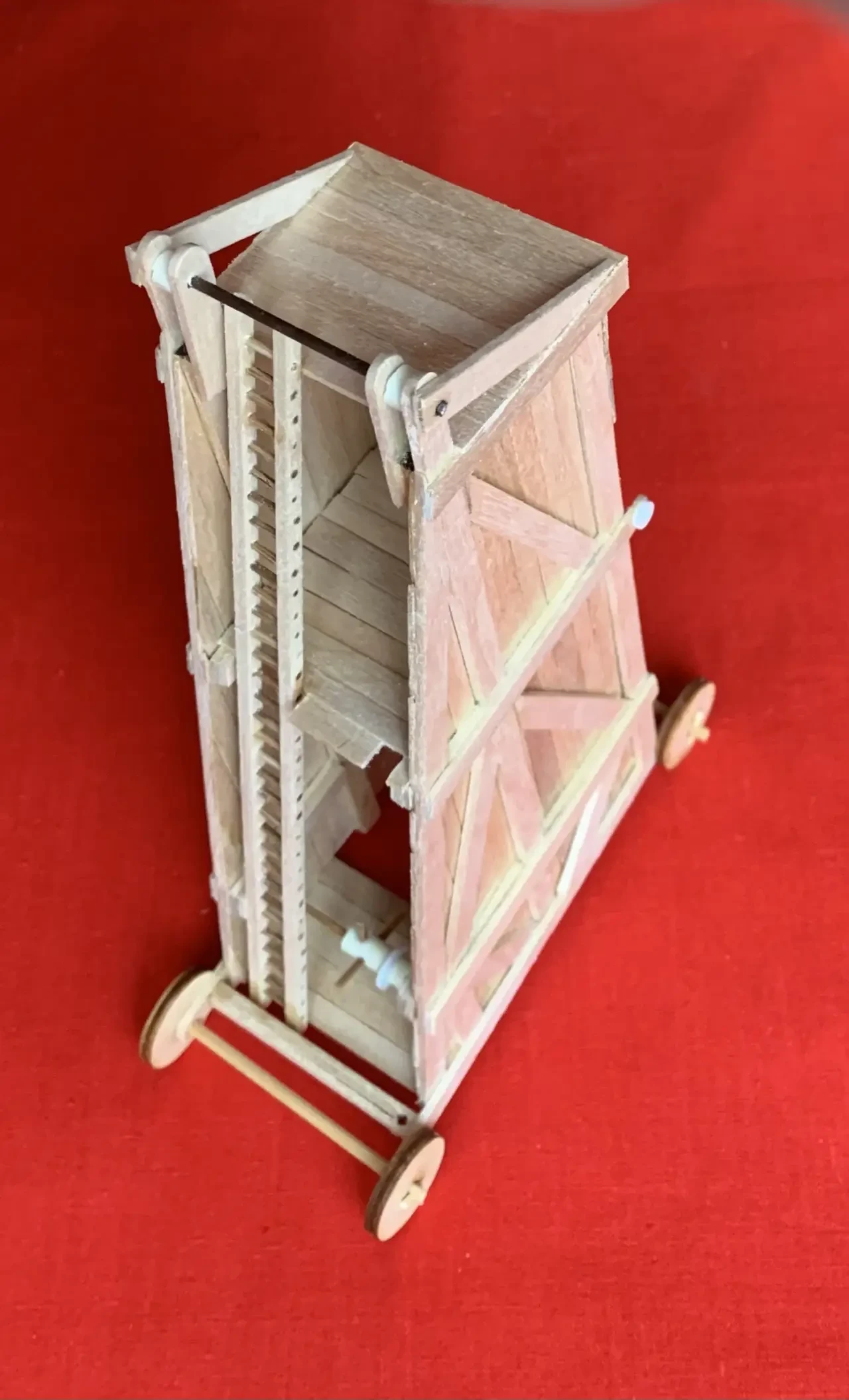 Макет такой осадной башни совсем не трудно сделать из палочек-мешалочек для кофе, склеенных клеем ПВА. Надо только иметь в виду, что они бывают разные. Для нашей цели лучше всего подходят самые длинные и толстые: 178х6х1,3 мм. Из них получаются отличные несущие балки. А вот на сами «доски» для обшивки башни годятся более короткие и тонкие: 140х5х1 мм.