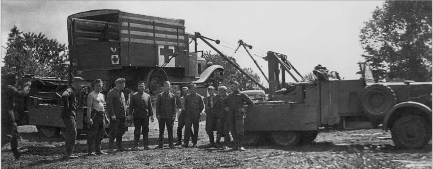Восстановление собственной брошенной или повреждённой техники. На фото эвакуируют средний тягач грузоподъёмностью 5 тонн mittlerer Zugkraftwagen 5t (Sd.Kfz. 6) ранней модификации