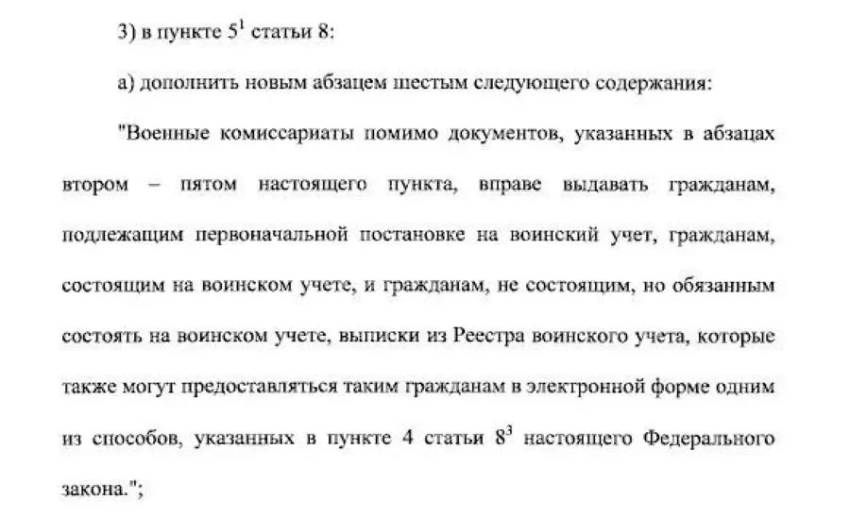 Военные комиссариаты могут выдавать выписки из Реестра воинского учёта в электронном виде. Фото: Выдержка из федерального закона от 04.11.2025 № 412-ФЗ