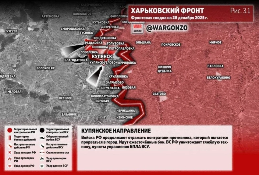 Карта боевых действий в Купянске на сегодняшний день, 29.12.2025