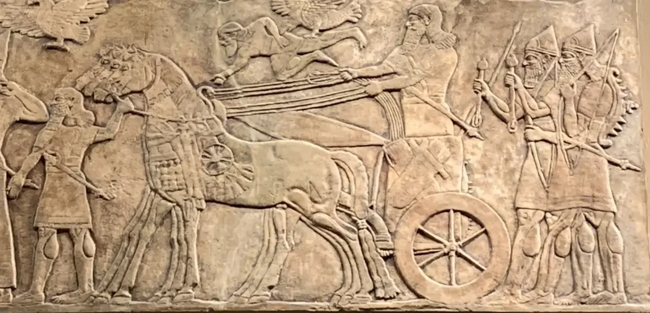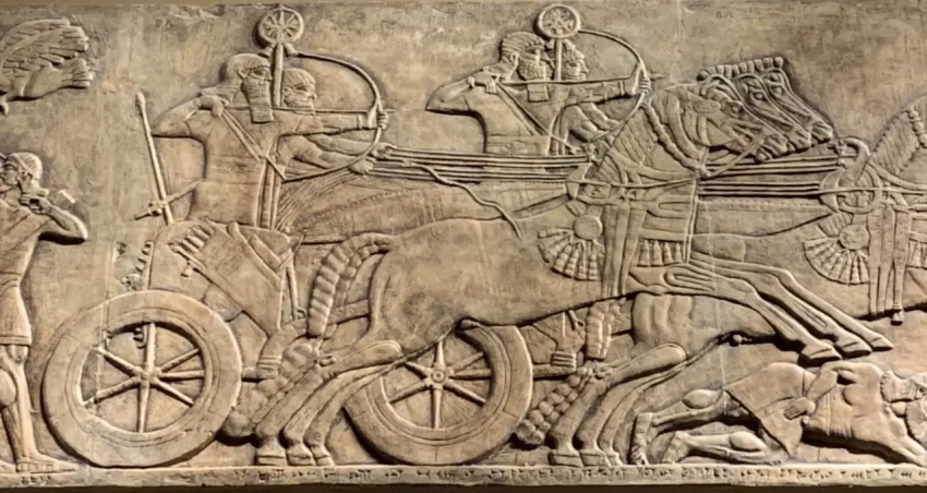 Ассирийские колесницы, запряженные тройкой лошадей, мчатся на врага. Колеса также с шестью спицами, но обода значительно массивнее египетских. На кузове, как и у египтян, видны пеналы для стрел и для лука, также в кузове находится флагшток с эмблемой, копье и щит, усаженный остриями. Музей им. Пушкина, Москва. Фотография автора