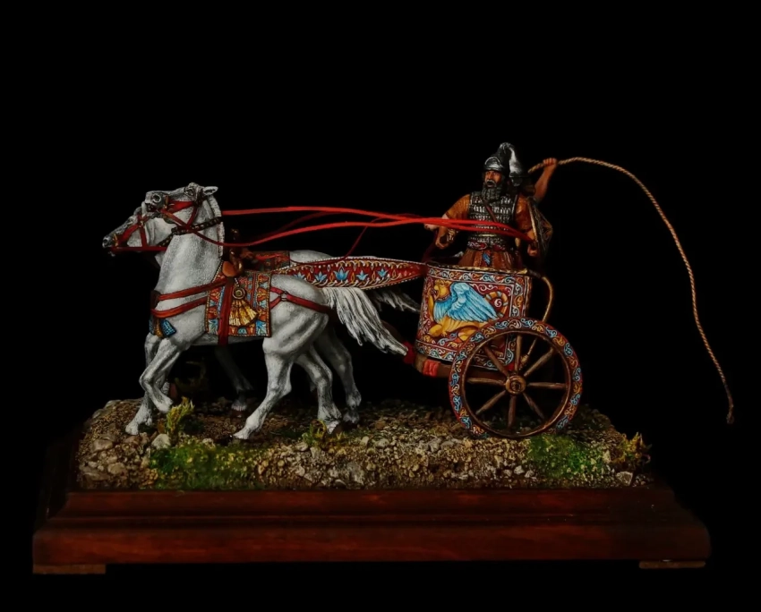 Ассирийская колесница. Я бы, конечно, не стал расписывать обода колес и стенки короба, но… красиво смотрится, что и говорить. Правда, царь в такой колеснице смотрелся бы эпичнее. Производитель: «Silver Dream Studio» и компания «Ниена»