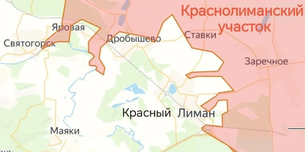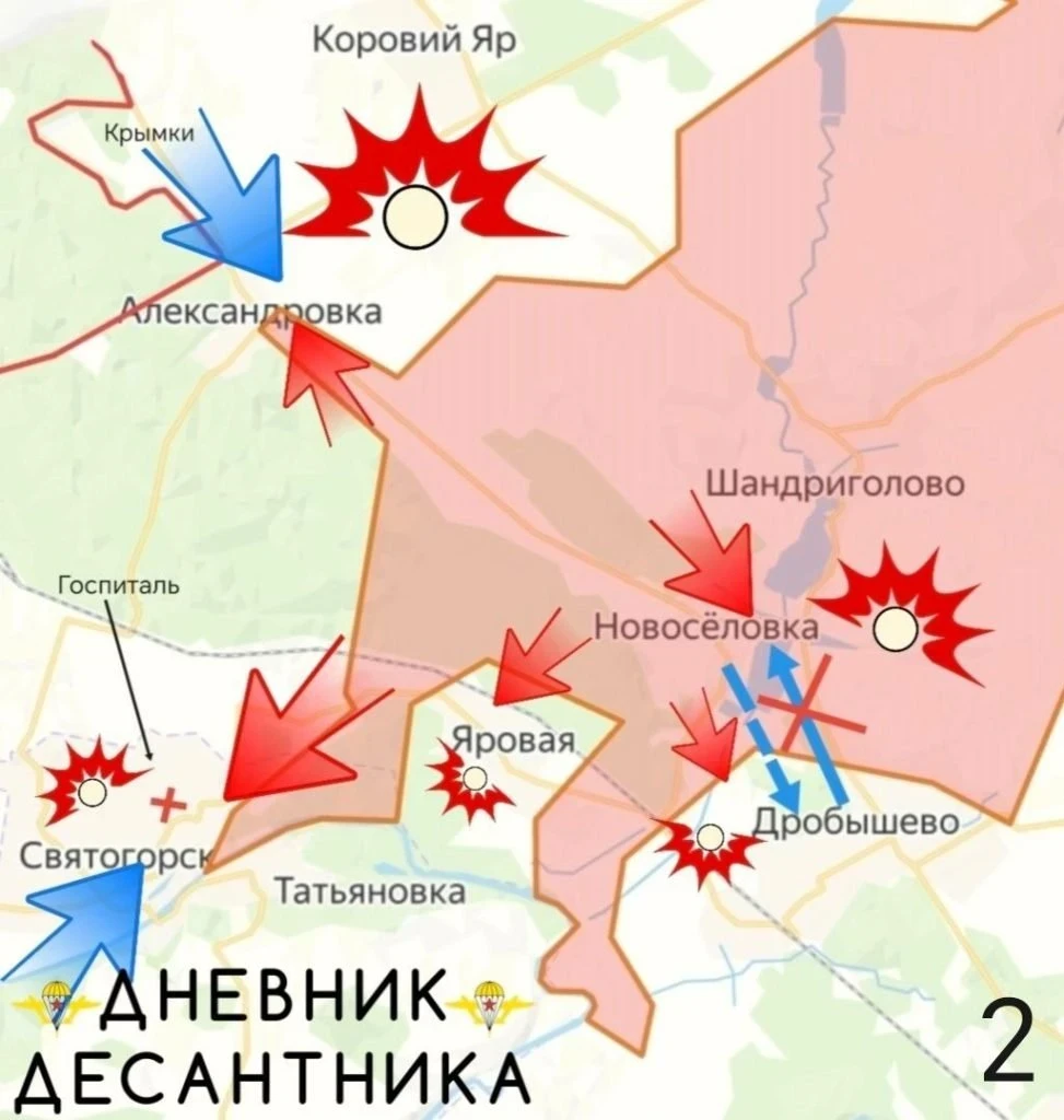 На Краснолиманском направлении идут ожесточённые бои за Ставки, Дробышево, Яровую. В Святогорске наши сражаются на территории госпиталя. Противник восстановил переправу Богородичное-Святогорск. ВС РФ пробиваются в восточную часть Александровки, бьются за опорники по периметру Коровьего Яра, сообщает в Telegram-канале Олег Царёв.