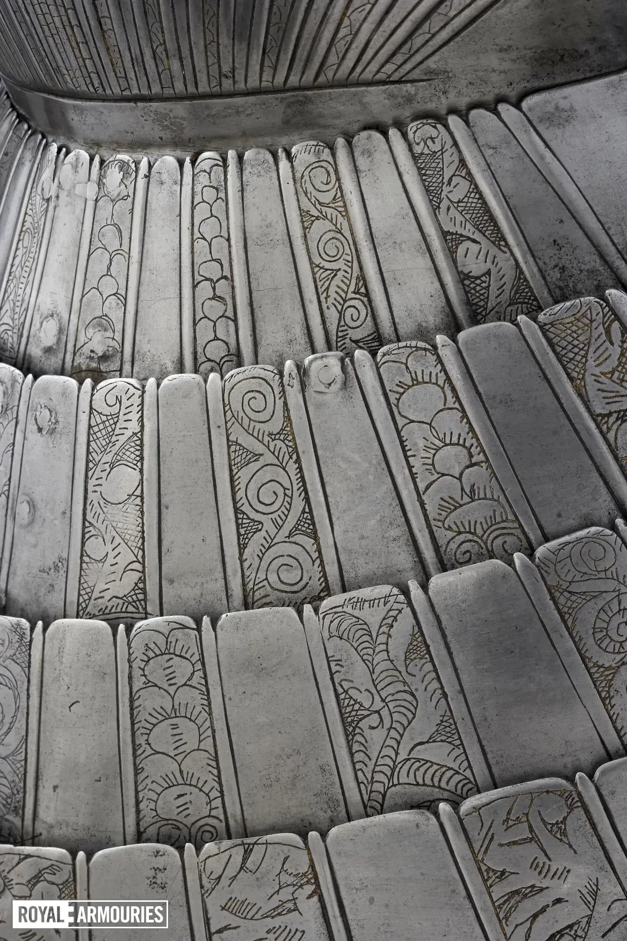 Наплечники из перекрывающих друг друга пластин стали отличительной особенностью мастерской в Гринвиче. Левый (если смотреть спереди) наплечник состоял из восьми полос, а вот правый почему-то из семи. Юбка состоит из девяти полос, как спереди, так и сзади. Петли на ней находятся слева, пряжки ремней справа. Латы для ног могли быть изготовлены в Италии или во Фландрии. Их попросту взяли от какого-то старого доспеха.
