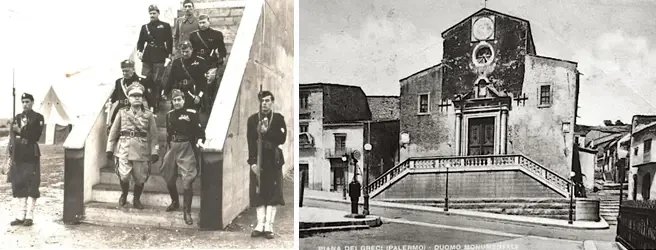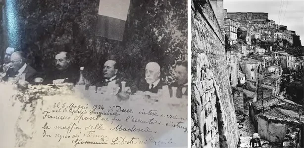 На фото слева: Муссолини в деревне Ганги во время своего вояжа на Сицилию в 1924 году, где его сделали почетным гражданином. На фото справа: деревня Ганги