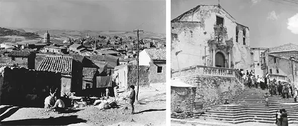 На фото слева: визит Муссолини на Сицилию. На фото справа: типичный городок Сицилии