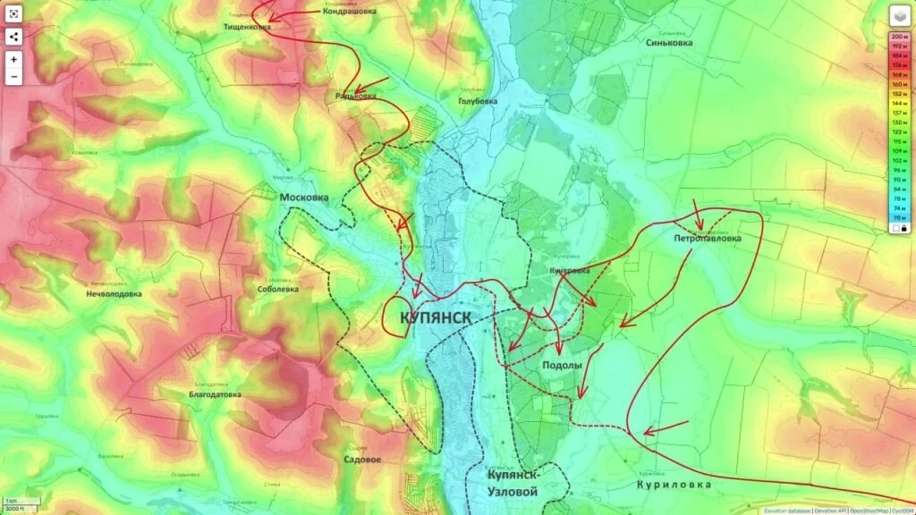 На Купянском направлении подразделения армии Российской Федерации, по поступающим данным, расширили зону контроля на левом берегу реки Оскол. Сообщается о переходе под контроль северной части села Куриловка, включая район Куриловка-1, через который проходит дорога на Купянск.