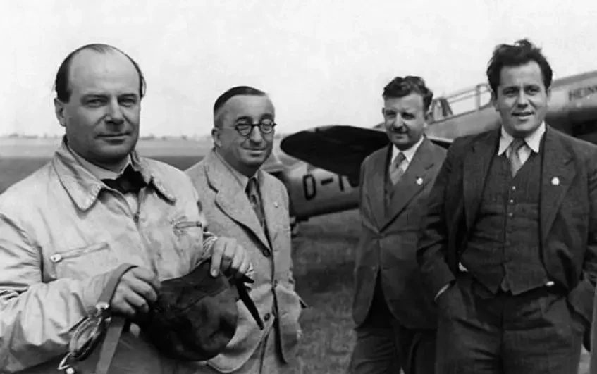 Легендарный герой Первой мировой войны, генерал Эрнст Удет (слева на переднем плане) и Эрнст Хейнкель с коллегами. На заднем плане самолёт-рекордсмен. Снимок сделан 07 июня 1938 года, на следующий день после рекордного полёта