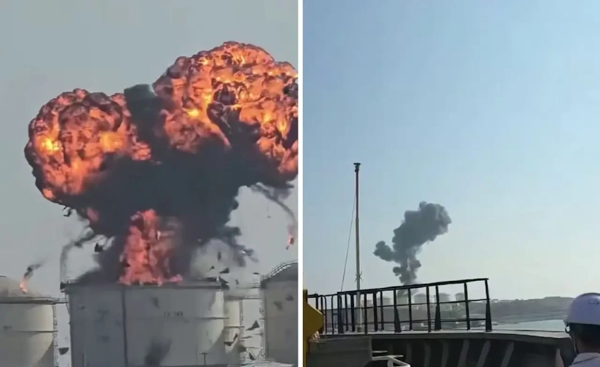 Тем временем в сети появляются кадры прилёта беспилотника по топливному терминалу в оманском порту Салала:
