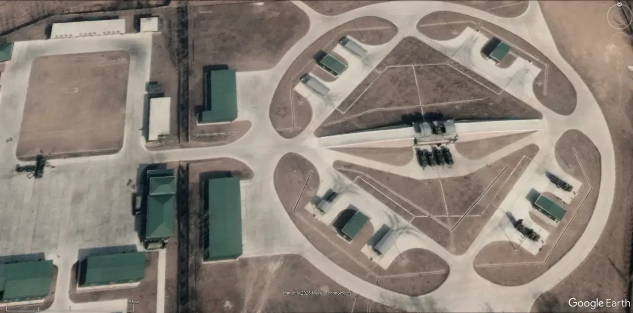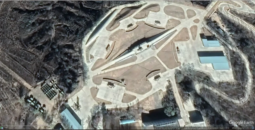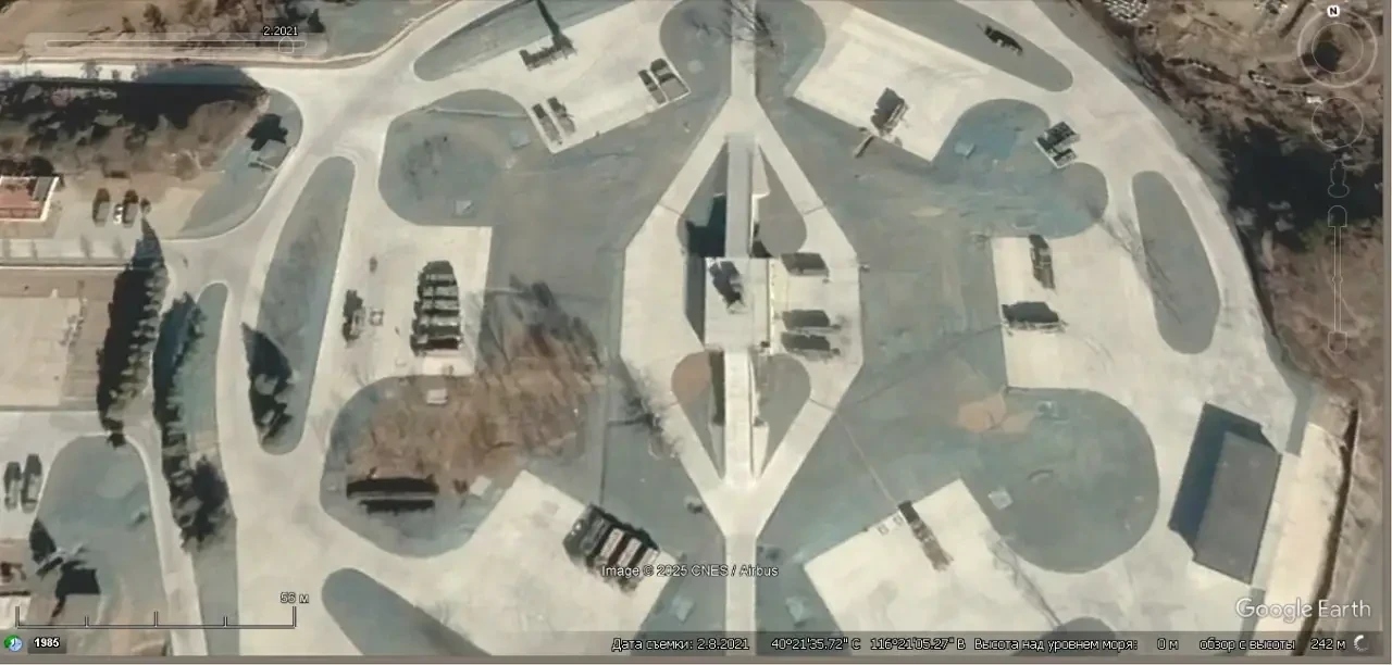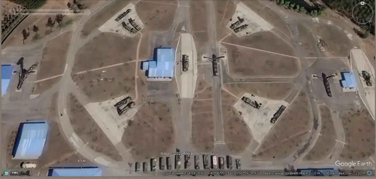 Спутниковый снимок Google Earth: ЗРК HQ-9 на реконструированной позиции HQ-2 северней Пекина. Снимок сделан в апреле 2023 года
