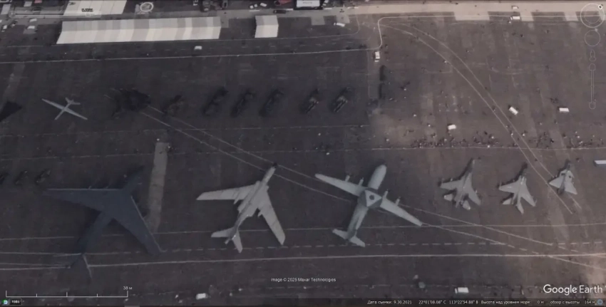 Спутниковый снимок Google Earth: элементы ЗРК НQ-22 среди других образцов на выставке Airshow China 2022 в аэропорту города Чжухай. Снимок сделан в сентябре 2022 года