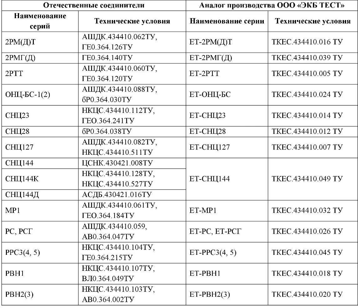 Таблица возможных замен отечественных соединителей аналогами производства «ЭКБ ТЕСТ»
