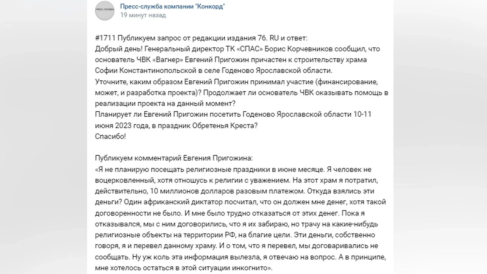 «Откуда взялись эти деньги? Один африканский диктатор посчитал, что он должен мне денег, хотя такой договоренности не было. И мне было трудно отказаться от этих денег. Пока я отказывался, мы с ним договорились, что я их забираю, но трачу на какие-нибудь религиозные объекты на территории РФ, на благие цели. Эти деньги, собственно говоря, я и перевел данному храму», — цитирует Пригожина пресс-служба компании «Конкорд».