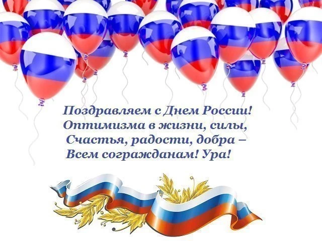 Поздравляю с Днем России и желаю в этот праздник процветания страны и светлого будущего, всеобщего блага и взаимоуважения в обществе, блестящих перспектив и стабильного успеха. Пусть каждый житель России будет счастлив, любим и горд своей страной.