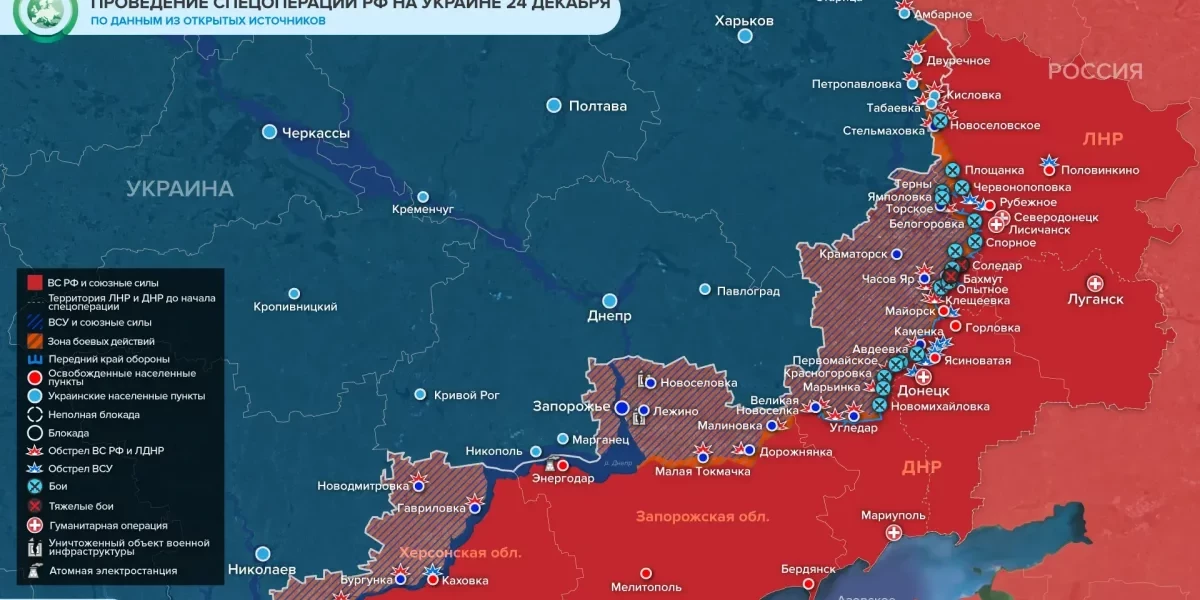 Карта боевых действий в зоне специальной военной операции на Украине и Донбассе по состоянию на 24-25 декабря 2022 года.