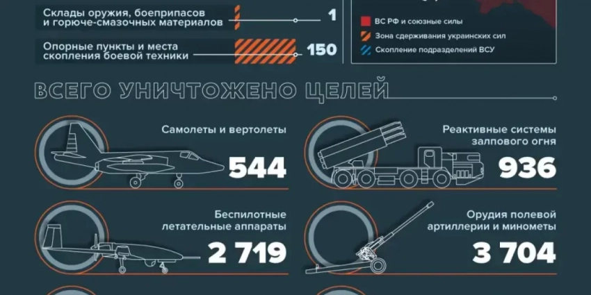 Всего с начала проведения специальной военной операции уничтожены: 352 самолета, 192 вертолета, 2719 беспилотных летательных аппаратов, 399 зенитных ракетных комплексов, 7222 танка и других боевых бронированных машин, 936 боевых машин реактивных систем залпового огня, 3704 орудия полевой артиллерии и миномета, а также 7737 единиц специальной военной автомобильной техники.