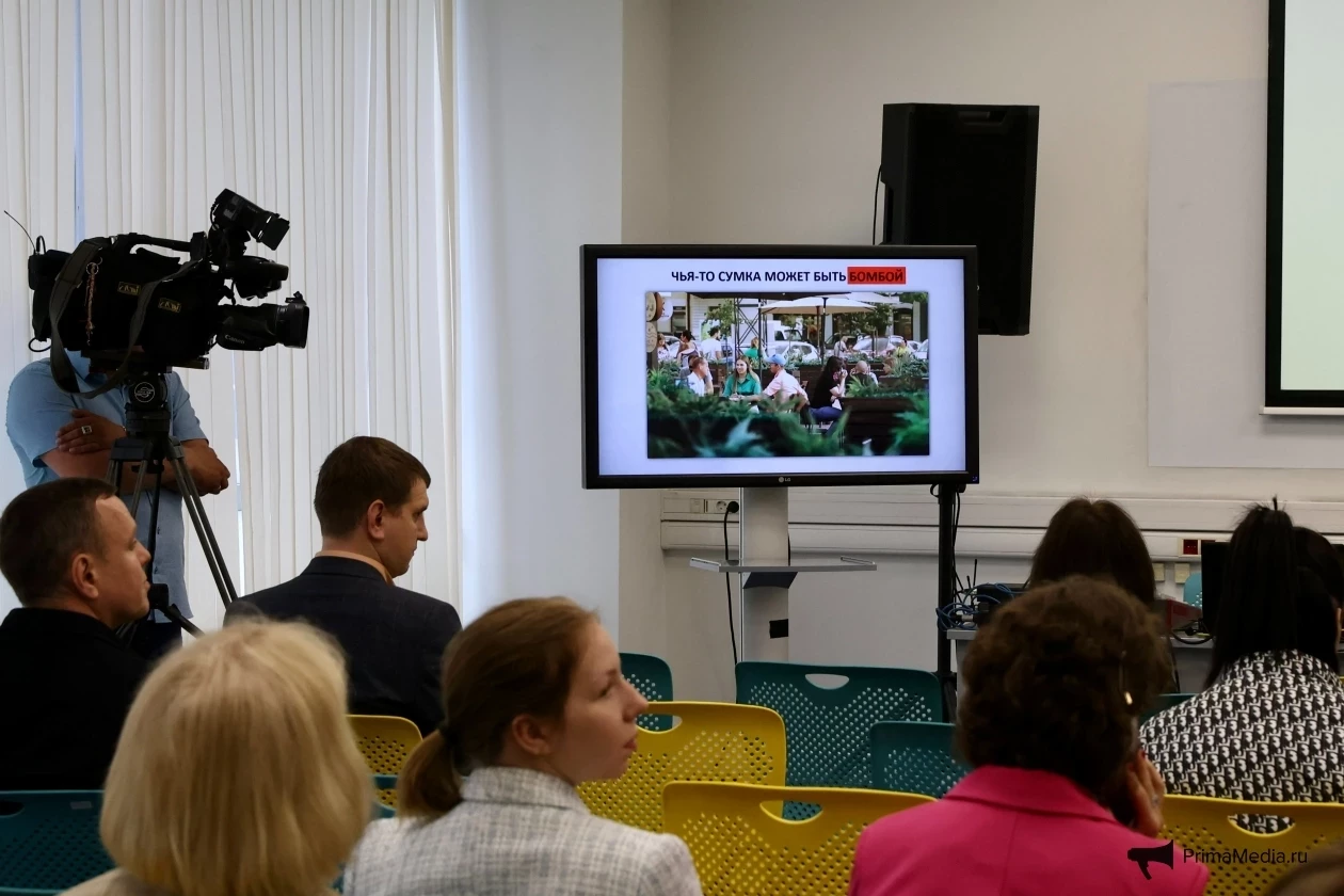 Александра Алексюк добавила, что в работе они используют и ролики. Она привела в пример видео, когда компания людей сидела в кафе на улице, рядом лежала сумка, мимо которой проходили люди. Сумку заметили, и она взорвалась. Ролик призывает к тому, что нужно обращать внимание на, казалось бы, банальные вещи, чтобы не случилось нечто ужасное.