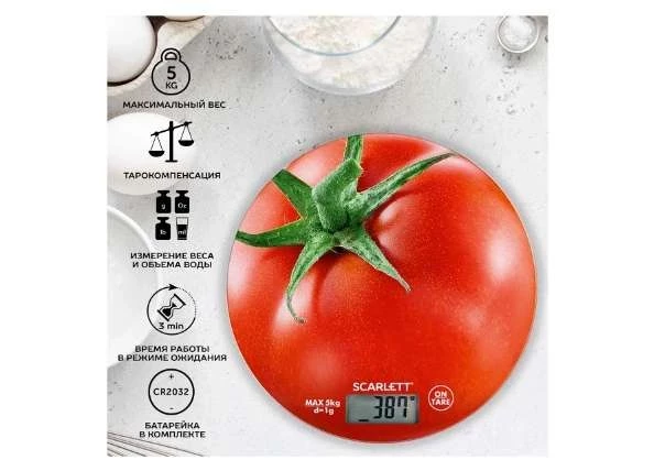 Открывает наш рейтинг весов Скарлет модель SC-KS57P74 – надежные и функциональные кухонные весы, идеальные для использования в повседневной готовке. Эти электронные весы обладают точностью измерения 1 г и предоставляют предел взвешивания до 5 кг. Вы можете выбирать удобные единицы измерения, такие как унции, миллилитры, граммы и фунты. Компактная платформа и прочный корпус из пластика делают их удобными в использовании и легкими в уходе. Материал платформы из стекла придает весам современный вид. Дополнительные функции включают автоматическое выключение и последовательное взвешивание, что упростит процесс приготовления блюд. Весы работают от двух батареек типа CR2032, обеспечивая долгий срок службы. Эта модель представляет отличное сочетание стиля и функциональности для каждой кухни.