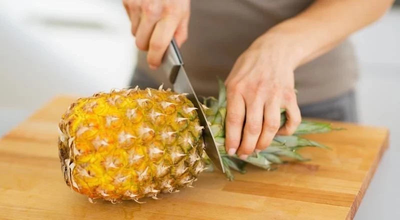 Зачастую отрезают верхнюю и нижнюю части ананаса и потом нарезают кусочками. Однако на самом деле наиболее эффективный способ есть ананас — это положить его на бок и нарезать его по слоям, оставляя кожуру. Так вы сможете сохранить большую часть сока и аромата, что сделает вкус ананаса еще более ярким и насыщенным.