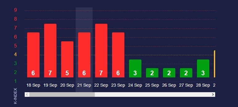 Согласно текущим прогнозам, следующей датой начала геомагнитного шторма станет 27 сентября. С 21:00 (по мск) активность должна усилиться с 2 до 3 баллов. На этом уровне она продержится до следующего вечера. После ожидается суточный пик геомагнитного шторма в 4 балла.