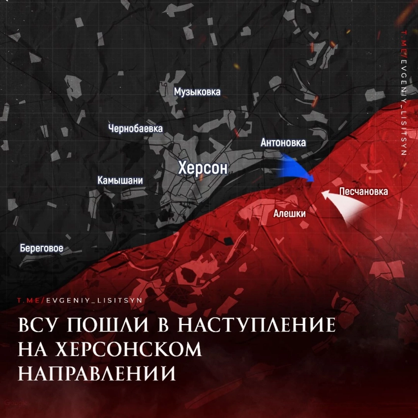 Отсутствие внятных результатов на Запорожском направлении у ВСУ вынудило украинское командование предпринять дерзкую попытку форсирования Днепра. Согласно данным из некоторых источников, противнику действительно удалось переправиться к востоку от Херсона и временно укрепиться в окрестностях Песчановки. Теперь, на переднем плане для русской армии стоит задача не допустить создания устойчивого плацдарма ВСУ на правом берегу. Отсутствие значительных укреплений и минирования области делает эту задачу особенно актуальной.