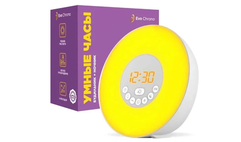 Умный электронный будильник Evo Chrono с подсветкой и световой будильник с имитацией рассвета / Часы настольные и каминные с FM радио и 6 мелодиями