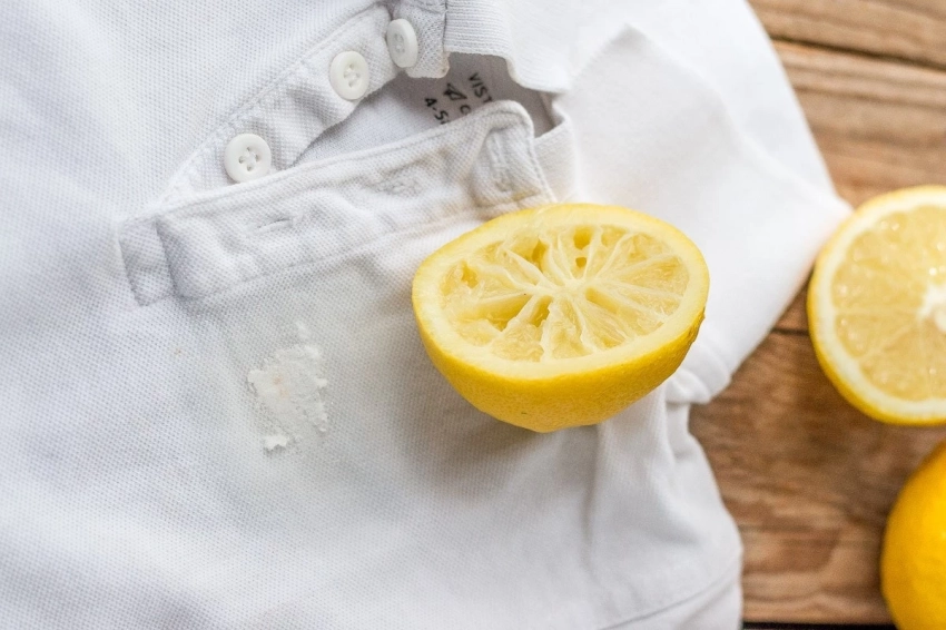 Лимонный сок является естественным отбеливающим, он отлично справляется с пятнами от пота. Смешайте лимонный сок с небольшим количеством соли, чтобы получить пасту. Нанесите ее на пятно и оставьте на несколько минут. Затем вымойте футболку или рубашку в холодной воде.