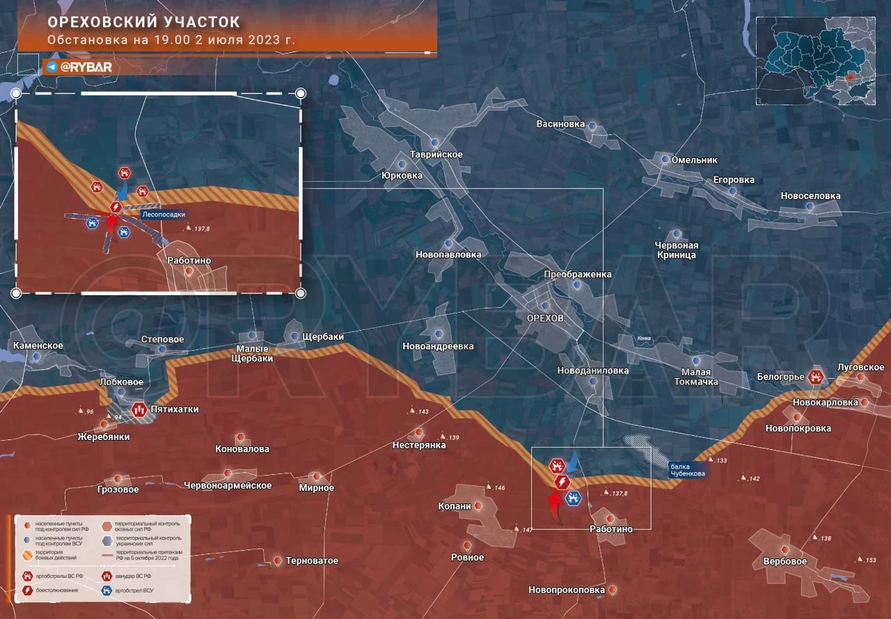 Карта боевых действий: Ореховский участок обстановка по состоянию на 21.00 2 июля 2023 года