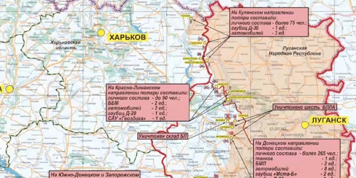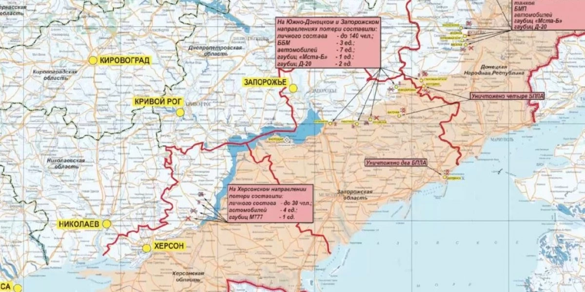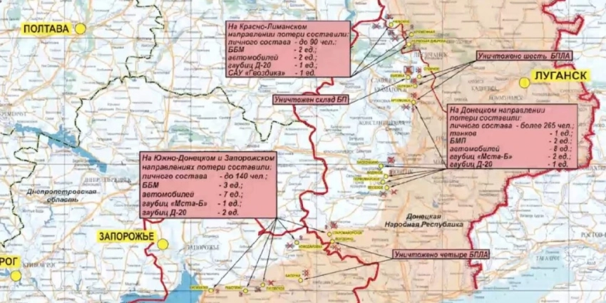 Потери противника за сутки на данных направлениях составили до 140 украинских военнослужащих, три боевые бронированные машины, семь автомобилей, две гаубицы Д-20, а также одна гаубица «Мста-Б».