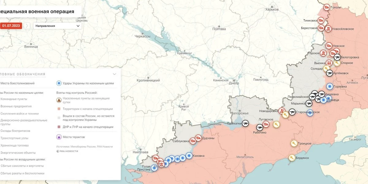 Карта боевых действий на Украине, к утру 2 июля 2023г., от РИА Новости. Карта специальной военной операции.