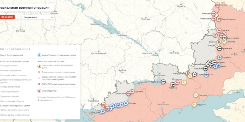 Карта боевых действий на Украине, к утру 2 июля 2023г., от РИА Новости