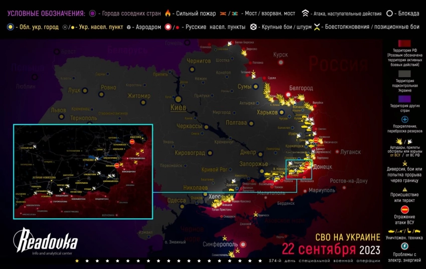- Обновленная карта военной операции на Украине, военных действий и ситуация на фронтах вечером 22 сентября от Телеграм-канала «Readovka»