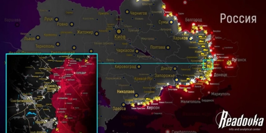 По данным МО РФ, пока штурмовики группы “Вагнера” ведут бои на западных окраинах Артемовска, российские бойцы на флангах отбили не менее 10 атак ВСУ. Самая напряженная обстановка сложилась под н.п. Красное (ДНР).