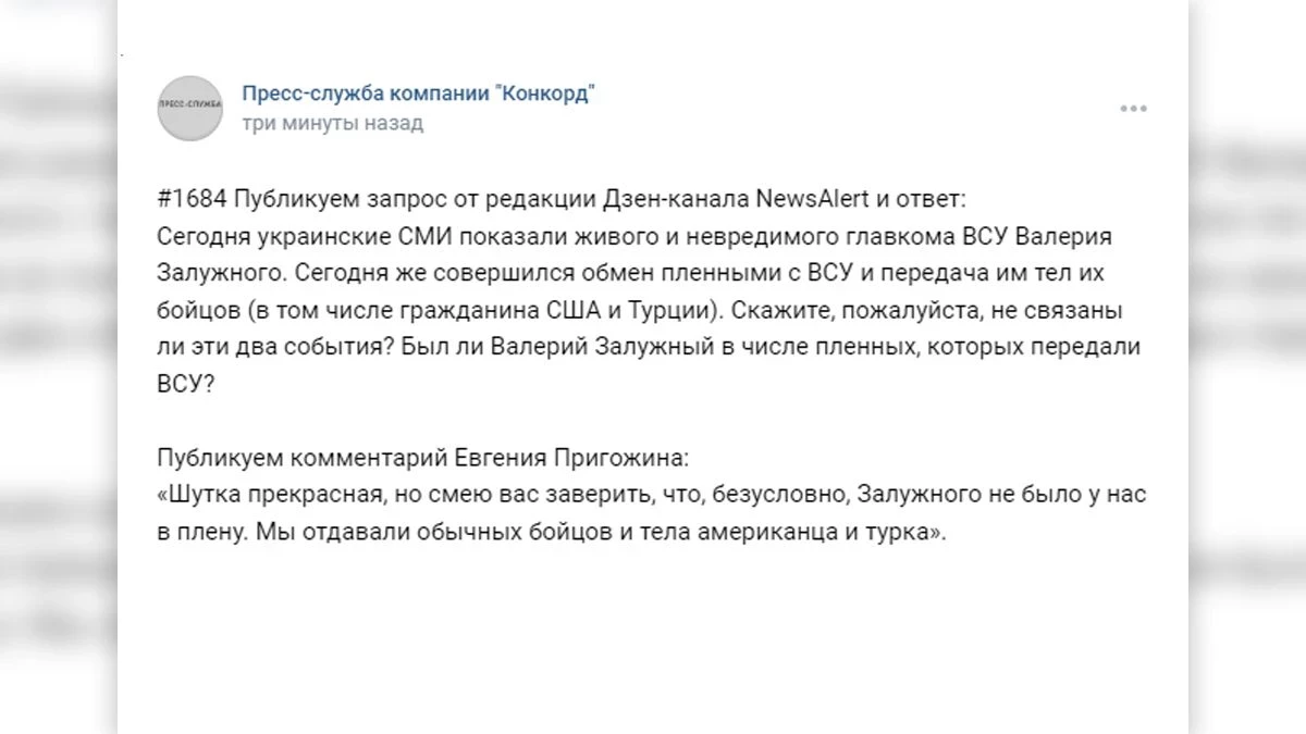 Отвечая на вопрос журналистов, существует ли связь между демонстрацией украинскими СМИ «живого и невредимого» Залужного и новостью о передаче Киеву бойцов, Пригожин заверил, что Залужного в плену у ЧВК «Вагнер» не было.