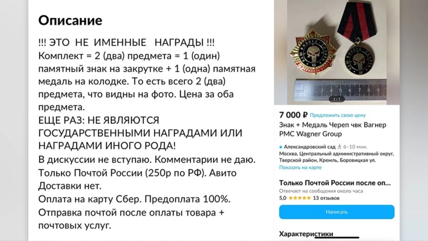 На площадке «Авито» ранее появилось объявление, автор которого продает медали ЧВК «Вагнер» за 7 тысяч рублей. Пригожин не увидел в этом ничего удивительного.