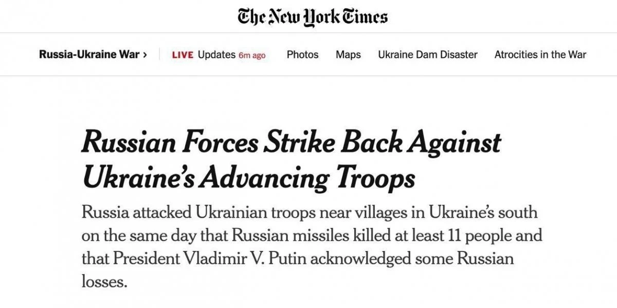 ? «Российская оборонительная стратегия воздушных контрударов может замедлить украинскую кампанию. ВСУ уже столкнулись с минными полями, траншеями, противотанковыми рвами, воздушными атаками и артиллерийским огнем», – пишет The New York Times.